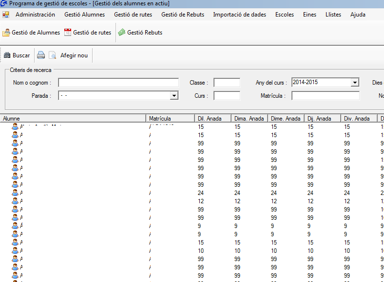 El programa lleva la gestión de todos los alumnos de las escuelas independientemente de si utilizan el servicio de línea o no, aparte de organizar todas las rutas de los autocares de línea, también realiza la gestión de los recibos de cobros mensuales de todos los alumnos que utilizan el servicio de autocar.