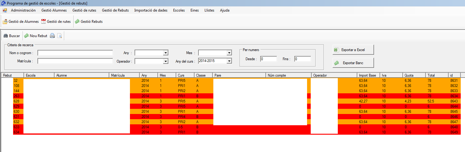 El programa está pensado para generar los recibos bancarios de cada mes para todos los alumnos que utilizan el servicio regular, con solo varios pasos es posible generar todos los recibos de todos los alumnos de los colegios, estos recibos posteriormente se exportan a un formato xml de recibos bancarios SEPA para su posterior proceso bancario: