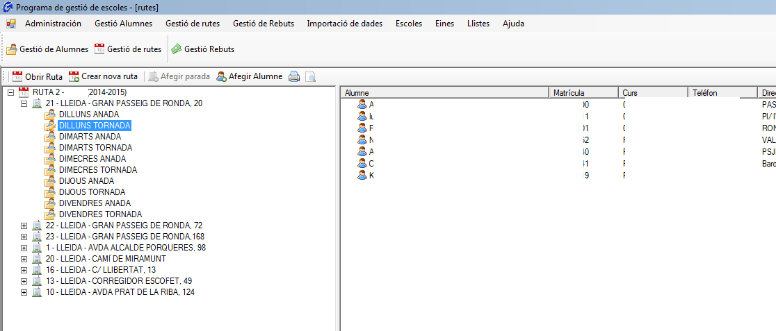 El programa lleva la gestión de todos los alumnos de las escuelas independientemente de si utilizan el servicio de línea o no, aparte de organizar todas las rutas de los autocares de línea, también realiza la gestión de los recibos de cobros mensuales de todos los alumnos que utilizan el servicio de autocar.